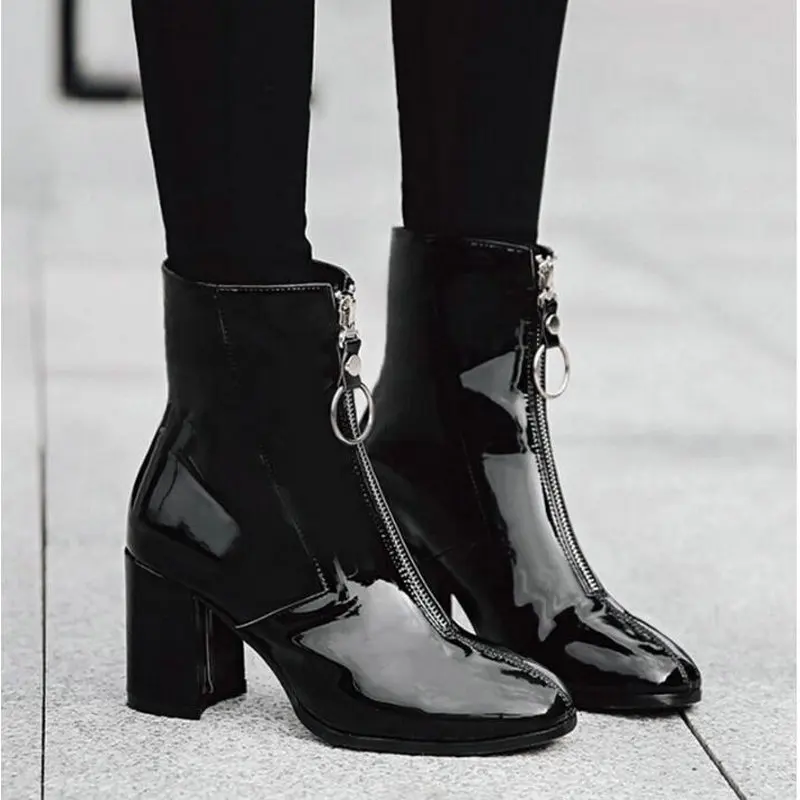 Kopen Goedkoop Herfst Mode Vrouwen Ronde Neus Vierkante hak Lakleren Laarzen 2019 Nieuwe hoge Hak 6 cm Laarzen Rits Chelsea laarzen TT 56Z Online