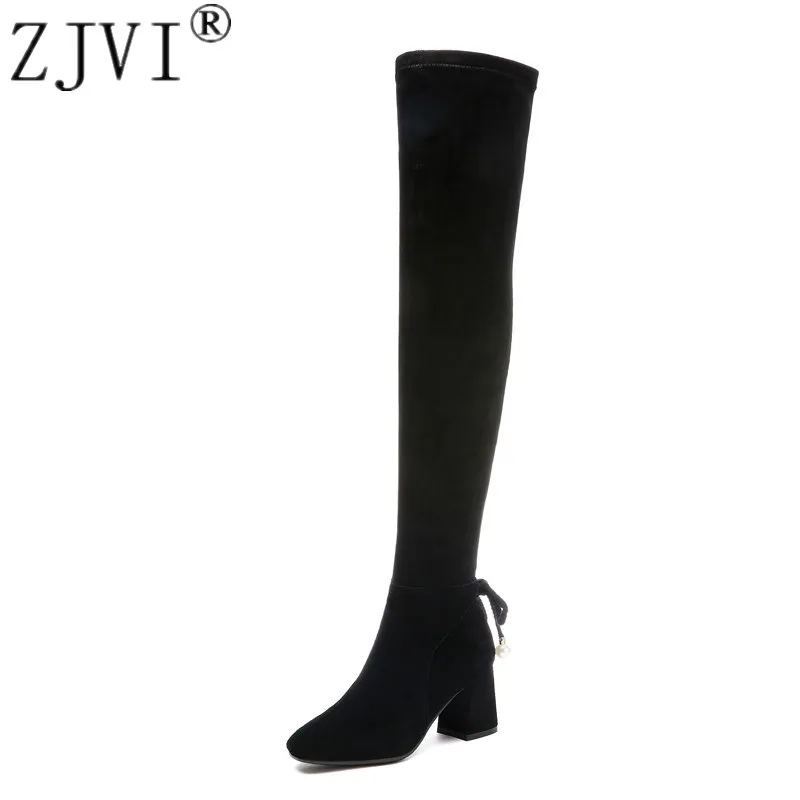 Goede Koop ZJVI vrouw suede lederen dij hoge laarzen vrouwen herfst winter over de knie laarzen vrouwen vierkante hoge hakken stretch schoenen Goedkoop