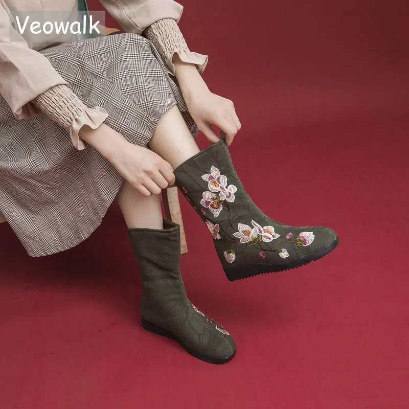 Goede Koop Veowalk Winter Fleece Voering Vrouwen Katoen Stof Upper Geborduurd Korte Laarzen Vintage Dames Slip op Losse Warme Schoenen Platte Goedkoop